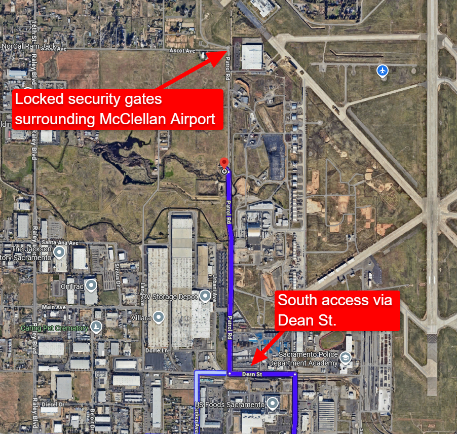 The security gates surrounding McClellan Airport remain locked outside of standard business hours. If you are visiting WCA in the evenings or on weekends, you must access Patrol Road from the south via Dean Street.